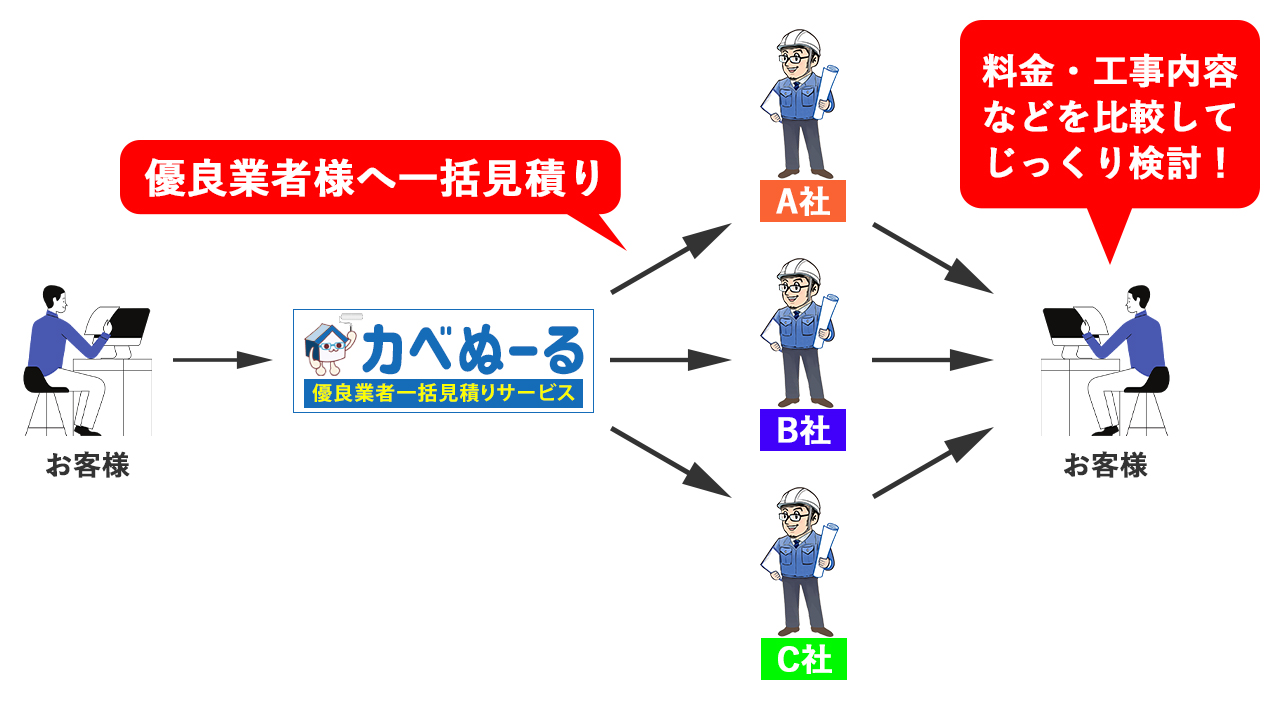 カベぬーるでは、仲介業者を挟まずに実際に工事を行う業者さんと直接契約になりますので中間マージン(紹介料)が発生することはありません。