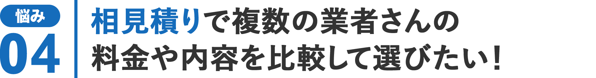 相見積りとは、1つの業者のみに見積り依頼をするのではなく、 同じ条件で複数の業者に見積りをしてもらい比較検討することです。