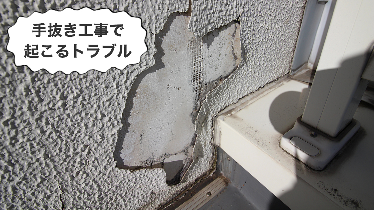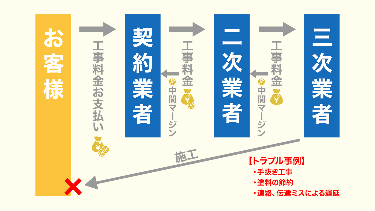 それにより、工事料金が高めに見積りされているケースや、 中間マージンが抜かれた後の末端の業者さんによる手抜き工事や塗料の節約(末端の業者もできる限り利益を出したいため) などによるトラブルが後を絶ちません。